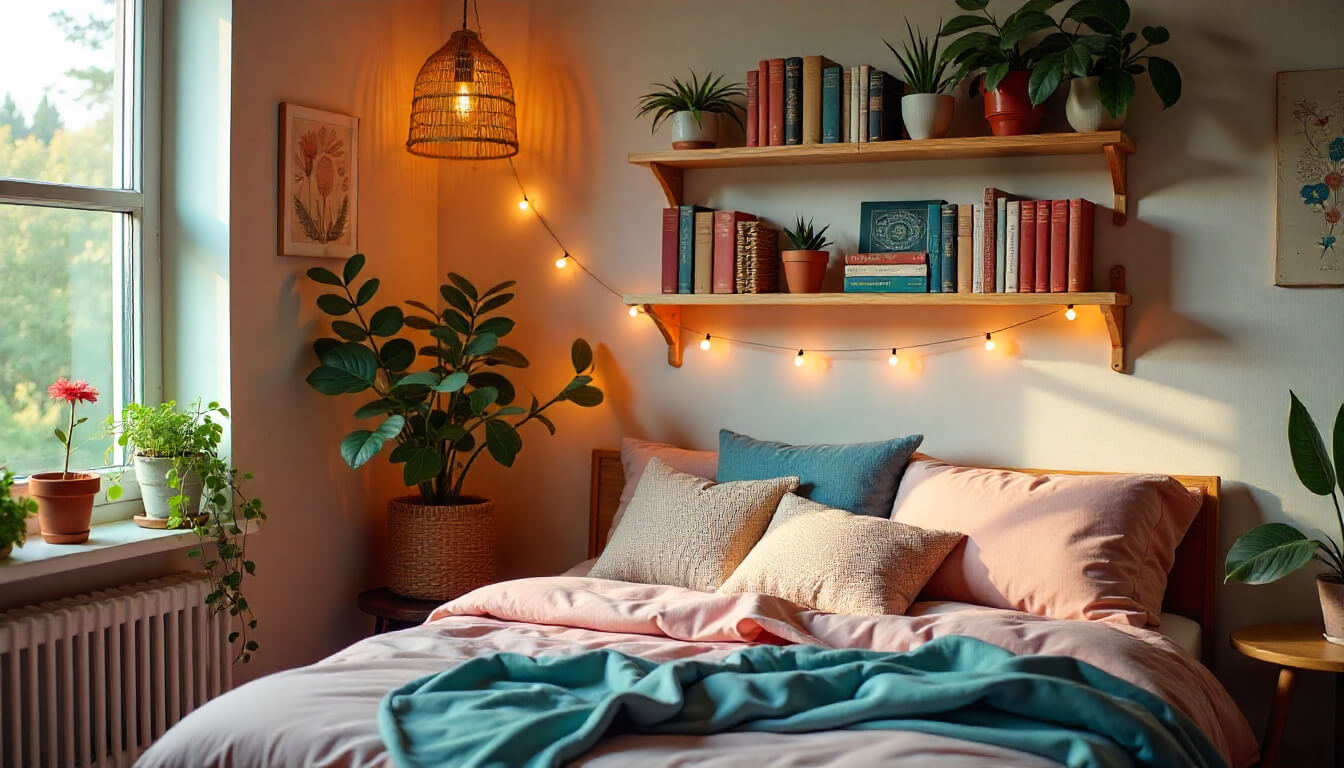 Bring a playful, bohemian vibe to your bedroom corner. Use colorful books, woven baskets, potted plants, and string lights to create a lively, cozy space. Mix textures like macrame, rugs, and throw pillows to enhance the boho charm.