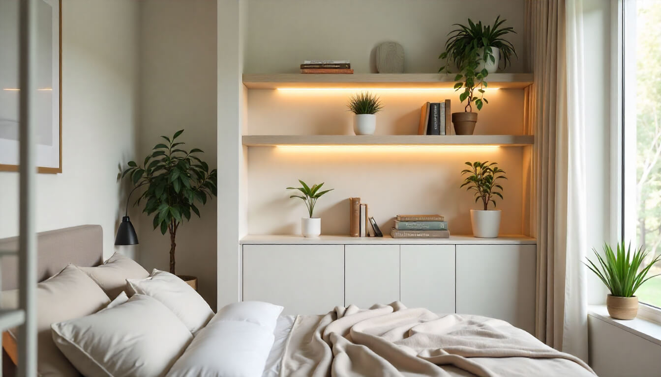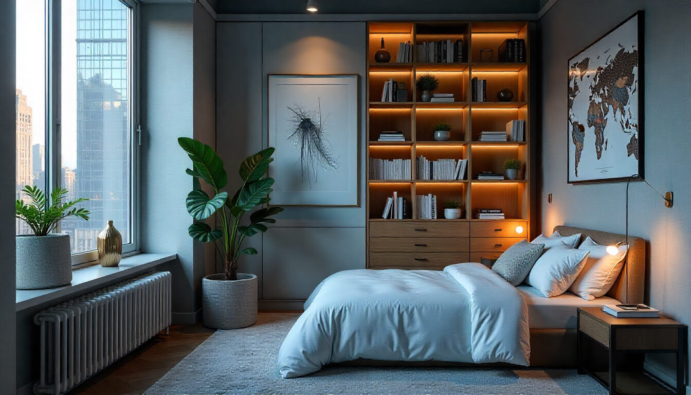 This is an ideal solution for small apartments where every inch counts, showing how bookshelves ideas for bedroom corner can blend functionality with modern design.