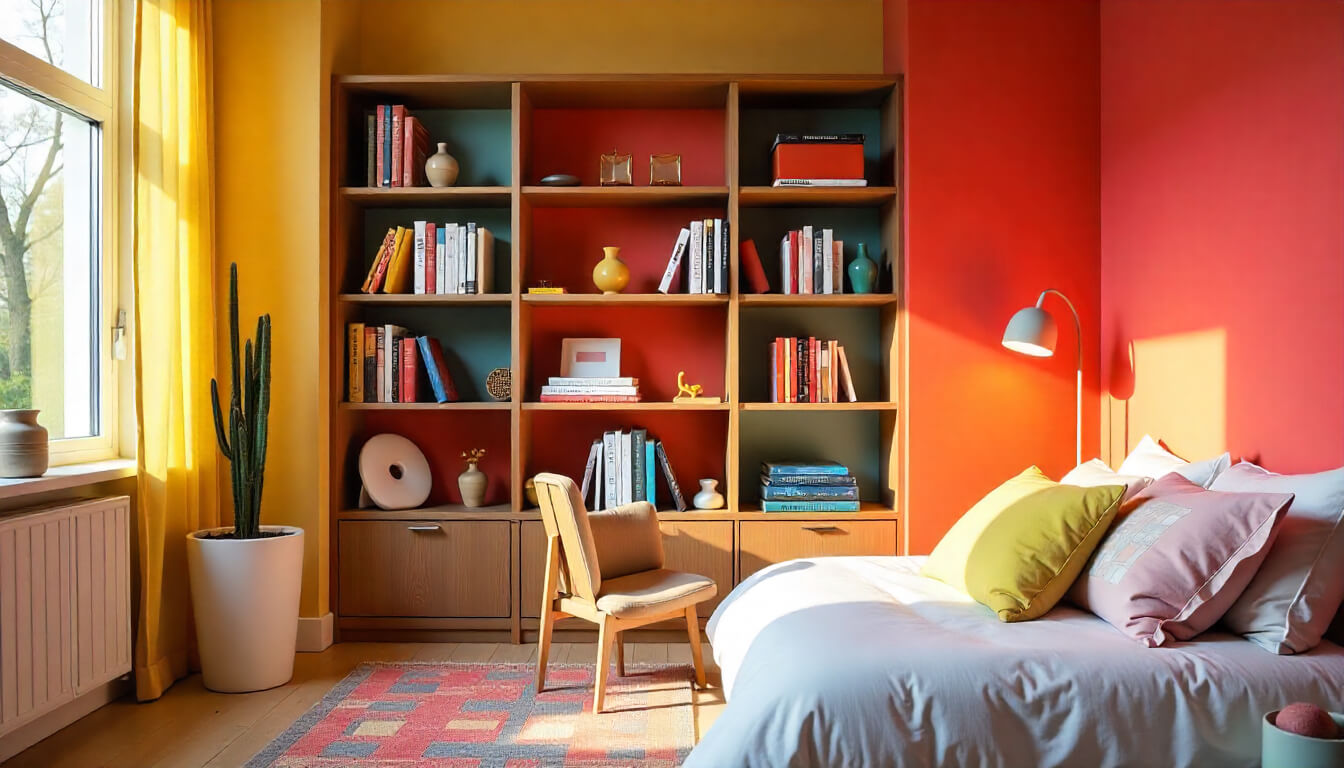 Bright, colorful corner shelves create energy and personality. Use accent walls and playful book arrangements to make your corner shelf ideas bedroom pop. Small plants or ornaments add balance and texture.