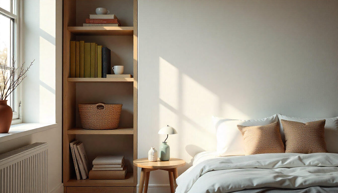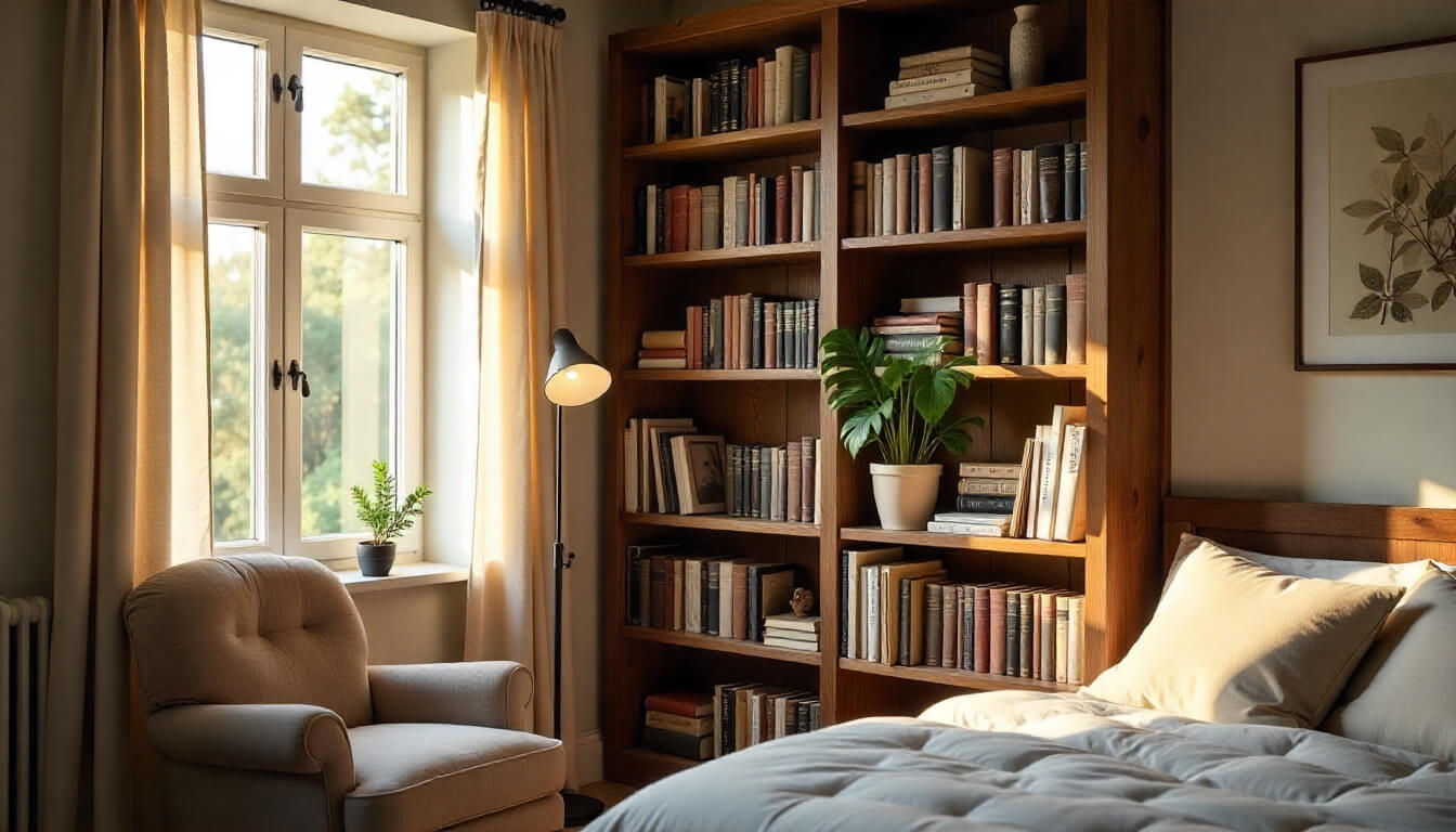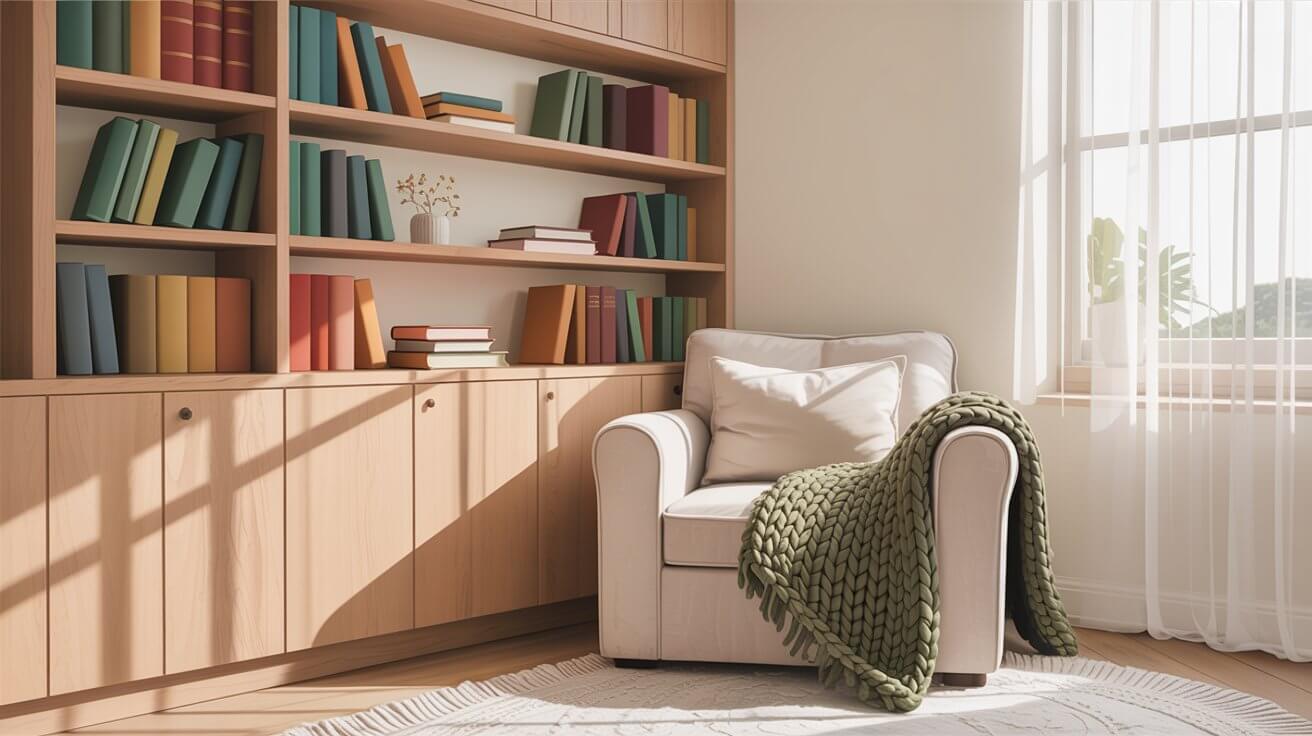 A small corner bookshelf can instantly create a welcoming atmosphere. Picture a built-in wooden corner shelf stacked with your favorite books, complemented by a plush armchair and a soft throw. Natural sunlight streaming through a nearby window enhances the cozy vibe, while a minimalist side table keeps essentials at hand.