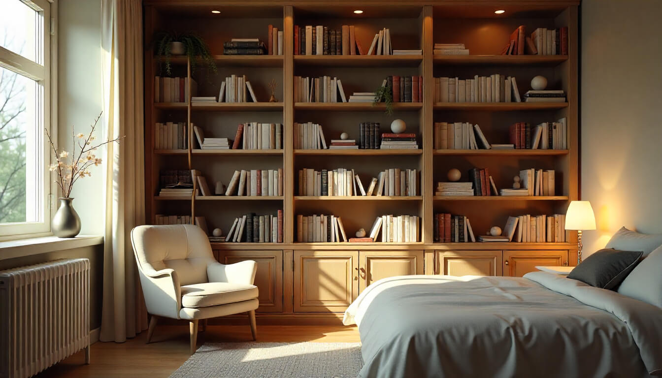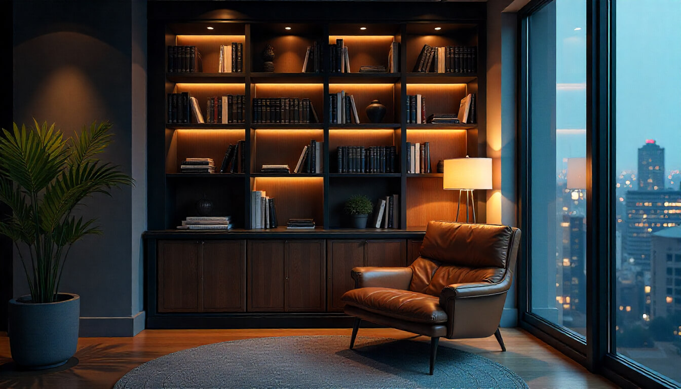 For a high-end feel, floor-to-ceiling corner bookshelves in a loft bedroom create elegance. Leather chairs, chic lighting, and decorative accents elevate the space. Evening lighting casts a golden glow, highlighting the luxurious atmosphere.