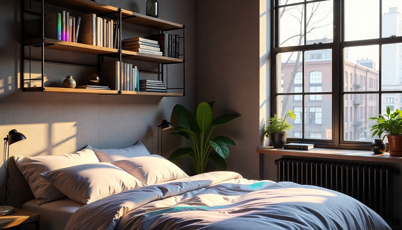 Give your bedroom an industrial edge with metal-framed corner shelves and reclaimed wood planks. Exposed brick walls, vintage lamps, and raw textures complement the shelves for an urban loft feel. This style combines strength, simplicity, and a touch of sophistication.