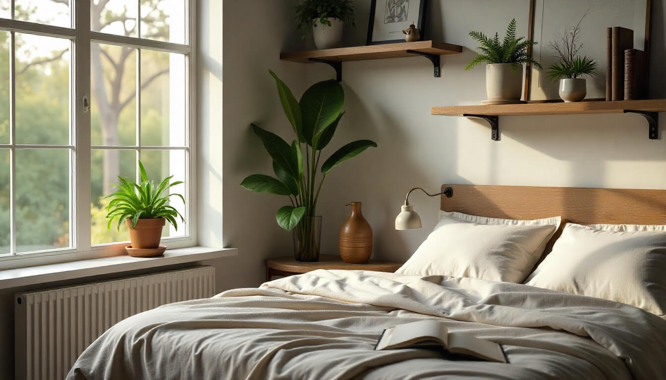 Incorporate greenery with nature-inspired corner shelves. Wooden shelves adorned with potted plants and books create a rejuvenating vibe. Soft natural light amplifies the organic tones for a serene, earthy feel.