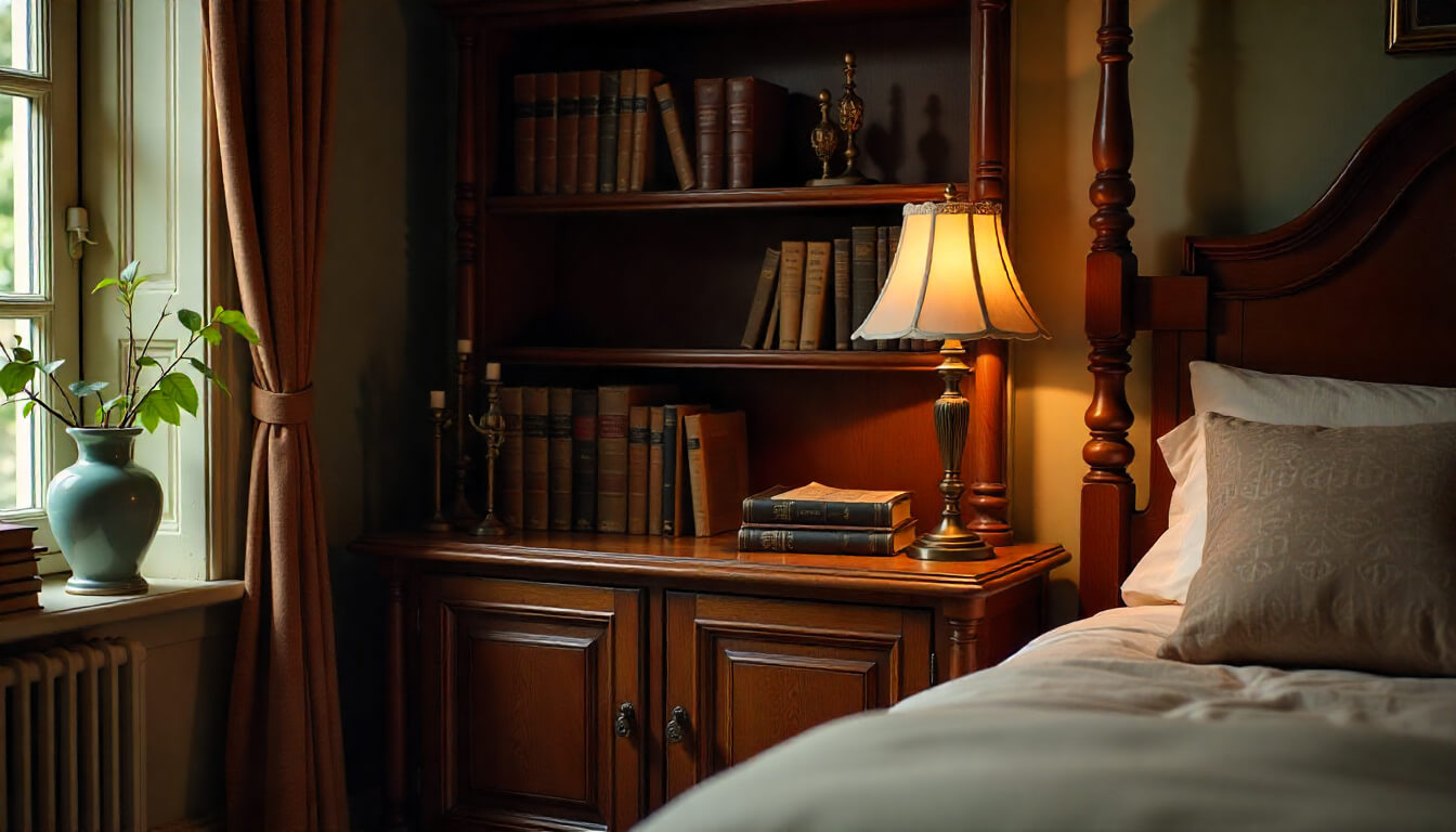 Bring classic charm with antique corner bookshelves. Rich wood tones, brass accents, and timeless decor create a luxurious, nostalgic vibe. Soft lighting from a table lamp enhances the warm, inviting atmosphere.