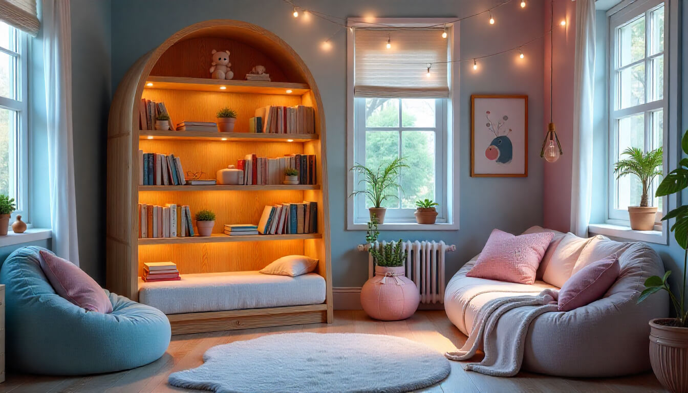 Add a touch of magic with curved or whimsical shelves. Pastel walls, fairy lights, and cozy seating make this corner feel like a fairytale. It’s perfect for a bedroom book corner ideas bedroom with a playful, dreamy atmosphere.